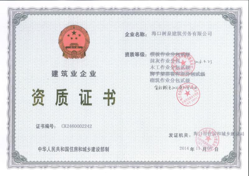 ??跇淙ㄖ趧沼邢薰境闪⒂?011年,公司位于海口,其前身是一家專業建筑施工隊,自2004年即開始在海南從事建筑勞務施工。自成立至今,公司已經擁有一支科學管理、質量過硬、能打硬仗,搶工期的專業隊伍。能獨立承擔大中型工業與民用建筑 、室內外裝修、各類機電設備安裝工程。代表工程有海口濱海華庭、三亞時代海岸T01/02/04/05棟高層、合肥東?;▓@二期、陵水富力灣B區高層、三亞金中海(酒店)、瓊海大印經典花園、??诃h球海景大酒店(四星級酒店,在建中)、陵水珍珠大廈(五星酒店)、海口萬達廣場、美蘭機場二期。